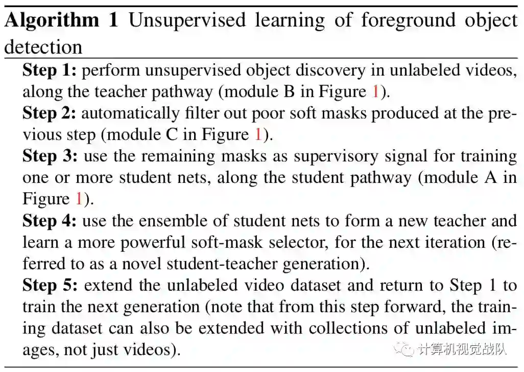 提出了一个系统,该系统由两条主要路径组成,一条是在视频或大型图像集合中沿teacher分支进行无监督的目标发现,另一种是student分支,它向teacher学习,在单个图像中检测前景目标。该方法是普遍的,因为student或teacher的路径不依赖于特定的神经网络架构或实现。此外,该方法允许无监督的学习过程在数代student和teacher中继续进行。在算法1中,给出了该方法的高级描述。