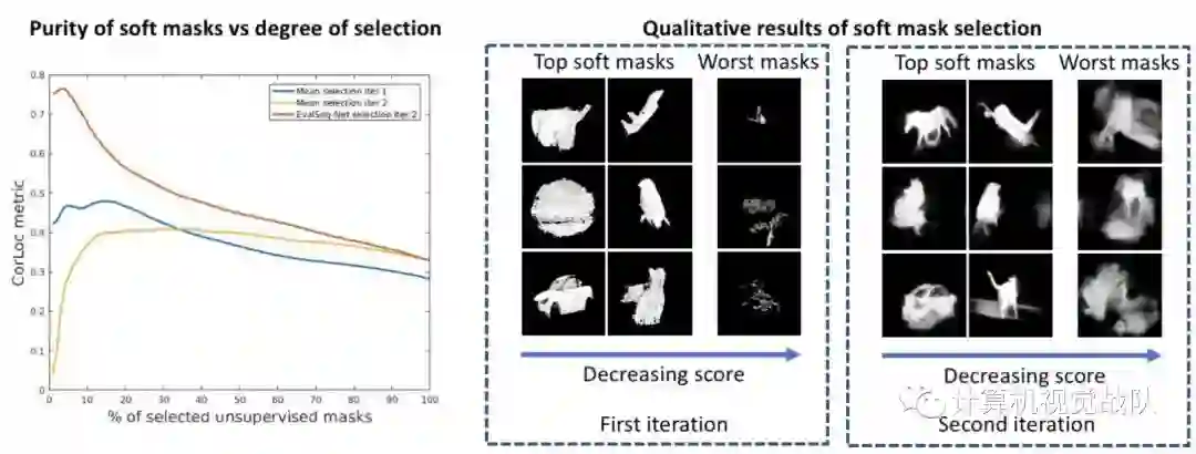 在Figure 3中,给出了分割性能w.r.t真实的目标框(仅用于评估)与自动选择后保持的掩码百分位数之间的依赖关系(用于两代人)。我们注意到保持帧的百分比与分割质量之间存在很强的相关性。同样明显的是,EValSeg-net比迭代1中使用的更简单的过程要好得多。即使在更复杂的情况下,EvaSeg-net也能够正确地评估软分段(见Figure 4)。