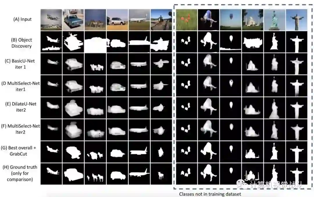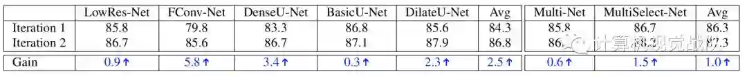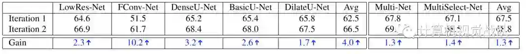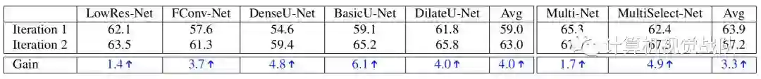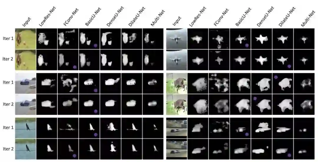 每次迭代时模型之间的视觉比较(生成)。用一个紫色的点标记了MultiSelect-net的输出(EvalSeg-net是最优秀的student soft-mask)。Multi-net表示五种模型之间的像素相乘,注意第二代的高级mask,有更好的形状,更少的洞和更锋利的边缘。