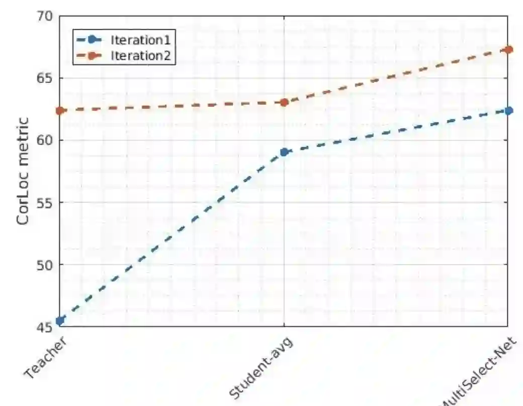 Teacher,individual student nets和组合的比较,跨越两代(蓝线-第一次迭代;红线-第二次迭代)。Individual student在两次迭代中都优于teacher,而组合甚至比individual nets更强。对于第二个迭代teacher,集成的MultiSelect-Net版本(因为这是一个上限)。图是根据YouTube对象数据集上的结果使用CorLoc度量(百分比)计算的。