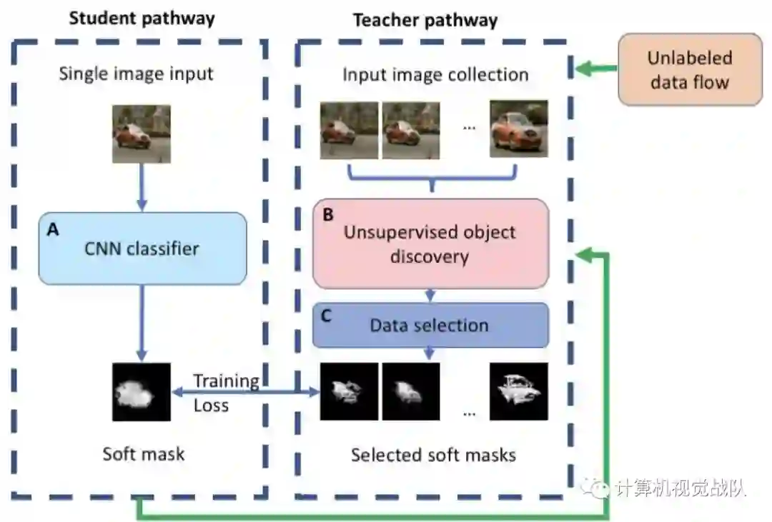 提出了一种真正的无监督学习的前景目标检测算法,为前景目标检测提供了经过多次迭代改进的可能性。该方法以互补的方式结合了适合这个任务的多个模块。它从teacher路径开始,在未标记的视频中发现对象,并在每个帧中生成前景目标的soft-mask。产生的低质量soft-mask然后被自动过滤掉。