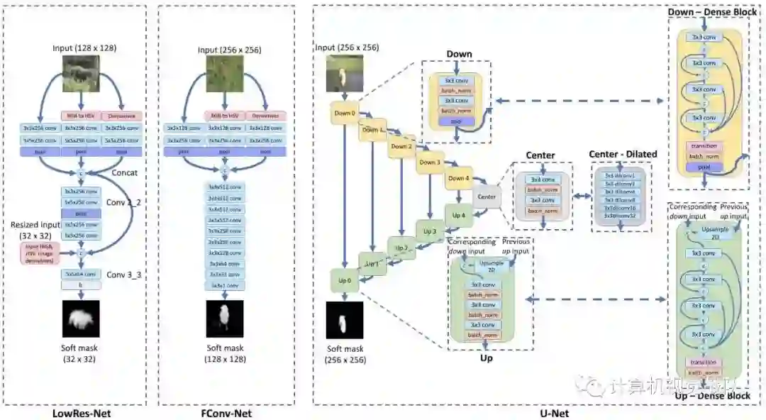 事实证明,skip connection可以提高性能,如文献所示(Raiko等人(2012年);Pinheiro等人(2016年)。我们还观察到,在使用skip connection时,实验也有类似的改进。LowRes-net以128×128 RGB图像(以及它的色调、饱和度和导数w.r.t.x和y)作为输入,并对图像中的主要目标进行32×32的软分割。由于LowRes-net在顶部有一个全连接层,因此降低软分割掩码的输出分辨率,以限制内存开销。虽然w.r.tx和y在原则上是不需要的(因为它们可以在训练期间通过适当的过滤器来学习),但是在测试中,明确地提供了与HSV一起的衍生产品,并且使用了skip connection,使准确率提高了1%以上。LowRes-net共有78M个参数,大部分都在最后一个全连接的层中。