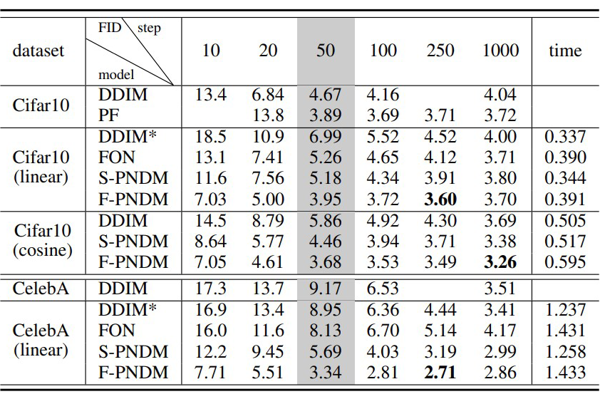 这也很大程度上解决了第二个问题,因为不需要整体改变迭代公式,这保证了迭代生成的轨迹和原始 DDIM 迭代公式相似。而 DDIM 的迭代公式恰恰可以保证生成数据和训练数据符合相同的分布。因此迭代过程可以大概率落在训练数据集中的高密度区域,不会跑出原始数据分布。先连续化再离散的策略则破坏了这种一致性,这也是 DDIM 能好于直接套用四阶数值方法的原因。