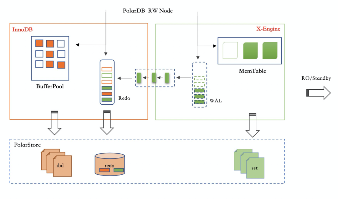 PolarDB支持X-Engine引擎后,X-Engine引擎与InnoDB引擎仍然独立存在。两个引擎各自接收写入请求,数据和日志均存储在底层的分布式存储上,其中idb文件表示的是InnoDB的数据文件,sst文件表示的是X-Engine的数据文件。这里最主要的点在于InnoDB与XEngine共享一份redo日志,X-Engine写入时,将wal日志嵌入到InnoDB的redo中,Replica节点和Standby节点在解析redo日志后,分发给InnoDB引擎和XEngine引擎分别回放进行同步。
