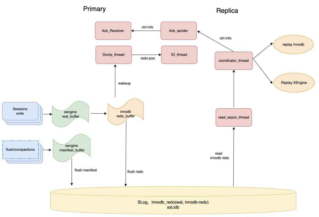 在InnoDB中有redo和undo两种日志,undo日志可以理解为一种特殊的“data”,所以实际上InnoDB的所有操作都能通过redo日志来保证持久性。因此,在进行复制时,只需要在主从节点复制redo日志即可。X-Engine引擎包含两种日志,一种是wal日志(WriteAheadLog),用于记录前台的事务的操作;另一种是Slog(StorageLog),用于记录LSM-tree形状变化的操作,主要指Compaction/Flush等。wal日志保证了前台事务的原子性和持久性,Slog则保证了X-Engine内部LSM-tree形状变化的原子性和持久性,这两个日志缺一不可,都需要复制同步。