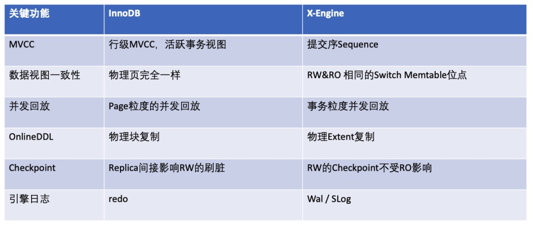 上节我们详细描述了基于LSM-tree架构的存储引擎,实现一写多读所需要的关键技术,并结合PolarDB双引擎介绍了一些工程实现。现在我们跳出来看看基于B+tree和基于LSM-tree两种数据组织结构在实现技术上的对比。首先要回到一个基本点,B+tree是原地更新,而LSM-tree是追加写,这带来的区别就是B+tree的数据视图在内存和外存一个缓存映射关系,而LSM-tree是一个叠加的关系。因而需要面对的技术问题也不同,B+tree需要刷脏,需要有double-write(在PolarFS支持16k原子写后,消除了这个限制);LSM-tree需要Compaction来回收历史版本。在一写多读的模式下面临的问题也不一样,比如,B+tree引擎复制是单redo日志流,LSM-tree引擎是双日志流;B+tree在处理并行回放时,可以做到更细粒度的页级并发,但是需要处理SMO(SplitMergeOperation)问题,避免读节点读到“过去页”或是“未来页”。而LSM-tree是事务级别的并发,为了保证RW和RO节点“内存+磁盘”的一致性视图,需要RW和RO在相同的位点做Switch Memtable。下表以InnoDB引擎和X-Engine引擎为例,列出了一些关键的区别点。
