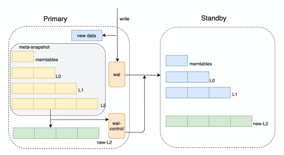 与共享集群复制不同,灾备集群有独立一份存储,Primary—>Standby需要传递完整的redo日志。Stanby与Replica区别在于日志来源不同,Replica从共享存储上获取日志,Standy从复制链路获取日志,其它解析和回放路径是一样的。是否将Slog日志作为redo日志一部分传递给Standby是一个问题,Slog日志由Flush/Compaction动作产生,记录的是LSM-tree形状的物理变化。如果也通过redo日志链路同步给Standby,会带来一些复杂性,一方面是X-Engine内部写日志的方式需要改动,需要新增新增文件操作相关的物理日志来确保主从物理结构一致,故障恢复的逻辑也需要适配;另一方面,Slog作为后台任务的操作日志,意味着复制链路上的所有角色都需要同构;如果放弃同构,那么Standy节点可能会触发Flush/Compaction任务写日志,这与物理复制中,只允许Primary写日志是相违背的。实际上,Slog同步写入到redo log中不是必须的,因为Slog是后台日志,这个动作不及时回放并不影响数据视图的正确性,因此,复制链路上只包含redo日志(X-Engine wal日志和InnoDB redo日志),Standby自己控制Flush/Compaction产生Slog日志,这样Standby也不必与Primary节点物理同构,整个架构与现有体系相匹配,同时也更加灵活。