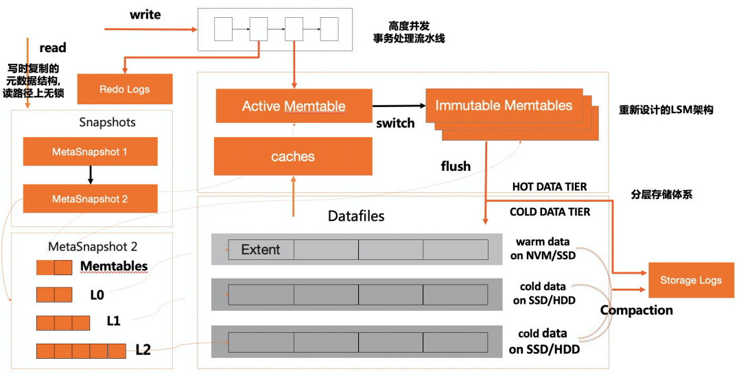 虽然Aurora,PolarDB和Socrates在设计上各有特点,但它们都共同践行了存储计算分离思想,数据库层面提供一写多读的能力。深入到存储引擎这一层来说,这几个产品都是基于B+tree的存储引擎,如果基于LSM-tree存储引擎来做呢?LSM-tree有它自己的特点,追加顺序写,数据分层存储,磁盘上数据块只读更有利于压缩。X-Engine引擎云上产品RDS(X-Engine)已经充分发挥了LSM-tree高压缩低成本特点,同样的数据量,存储空间只占到RDS(InnoDB)的1/3甚至更少,RDS(X-Engine)传统的主备架构,依然面临着主备复制延迟大,备份恢复慢等问题。基于LSM-tree引擎实现一写多读,不仅计算资源和存储资源解耦,多个节点共享一份数据还能进一步压缩存储成本。