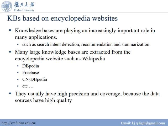 大家都知道,知识库在很多应用中都担任着非常重要的角色。有些知识库使用百科类网站(如:维基百科)作为数据源,像DBpedia、Freebase,CN-DBpedia等。由于百科类网站的质量都很高,所以在此基础上构建的百科知识图谱质量也很高。