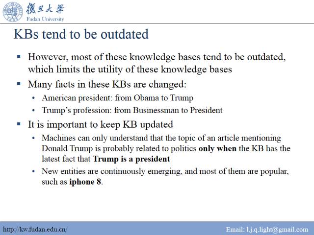 知识库中的知识并不是一成不变的,很多事实都会发生变化。例如,美国总统从奥巴马变成了特朗普;特朗普的职业从商人变成了总统。这样一来,知识图谱的更新就显得非常重要。如果不知道特朗普是总统,机器在阅读最新文章时,可能只会把他认为是一个普通商人发表的政治意见。还有很多新词,比如说iPhone8,你将永远不知道它是什么。