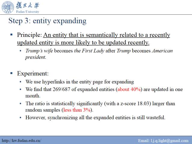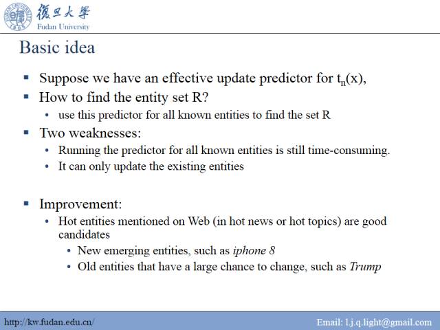 一个改进的方法是对互联网上的热词进行监控。因为我们认为,一个实体之所以变成热词,会有两个原因。一个是新词,比如即将发布的iPhone8。另一个是旧词,但知识发生了变化,比如说特朗普变成美国总统了。