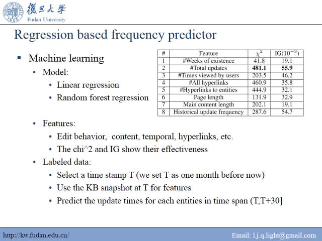 我们把这个问题看作是一个回归问题。选择了表中的8个特征,分别使用了线性回归和随机森林回归两种来估计更新频率。