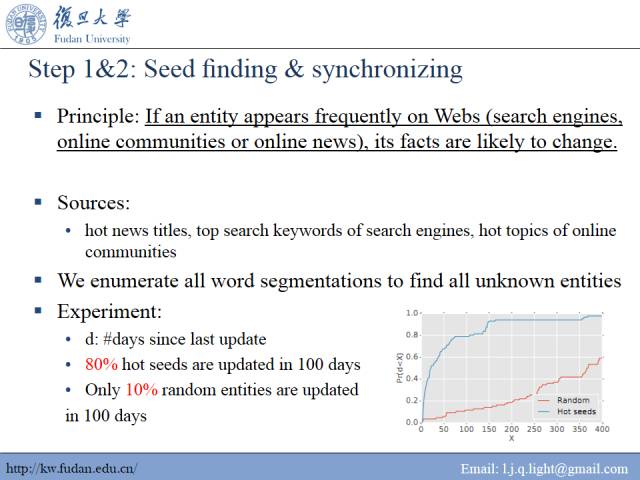 我们发现一个现象,如果一个实体突然频繁地出现在互联网上,关于它的知识很可能就会发生变化。因此,我们从互联网上搜集热门新闻,热门搜索关键字和热点话题,通过分词等方法,提取出其中的热门实体,然后加以同步。