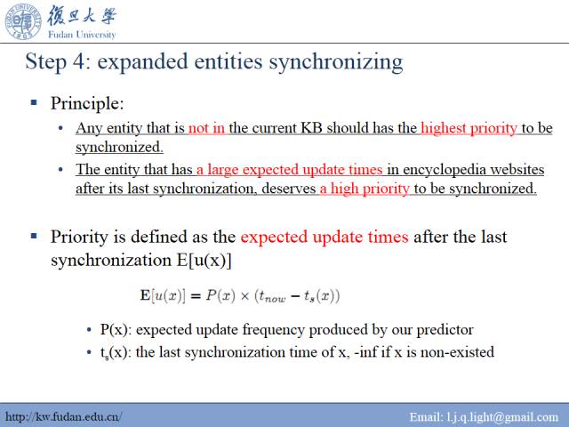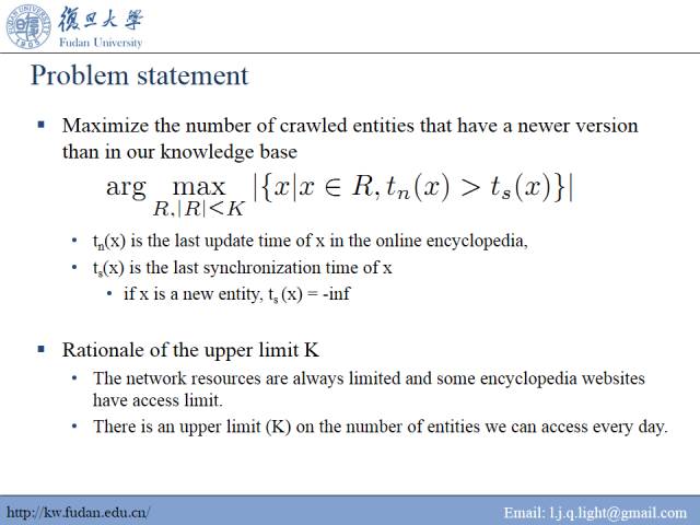 接下来是具体实现细节。我们首先将这个问题定义为一个最大化问题,选择最需要更新的K个实体。一个实体是否需要更新就看在线百科网站上实体的最近更新时间是否晚于我们知识库中的上一次同步时间。