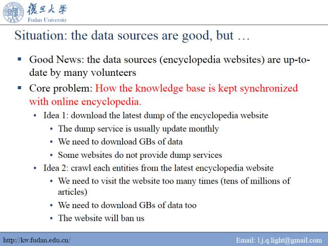 首先, 许多知识库都是使用百科网站作为数据源,但是这些知识库往往不能及时更新。每个都重新构建一遍代价巨大。