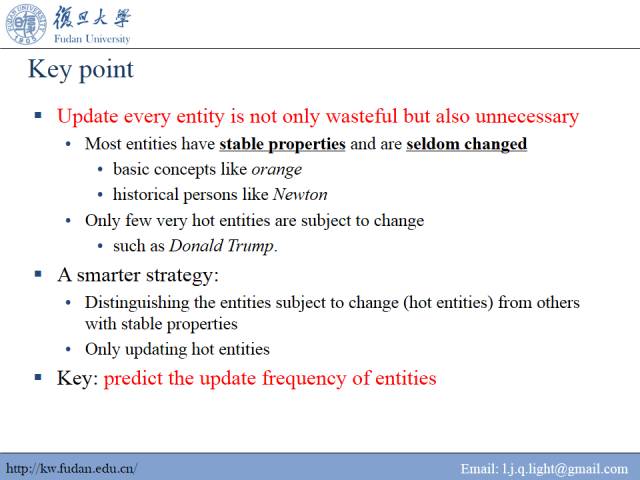 知识库的更新固然重要,但也不是说库中的每个实体都需要更新,因为大多数实体都具有稳定的性质,它的关系很少会发生变化,例如,“橙子”,这是一个基本概念;“牛顿”,这是一个不会改变的历史人物。