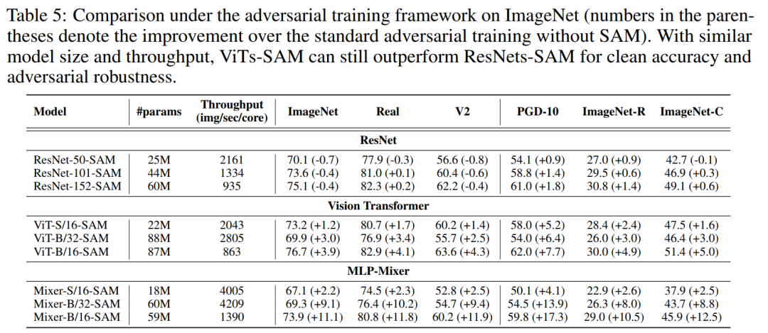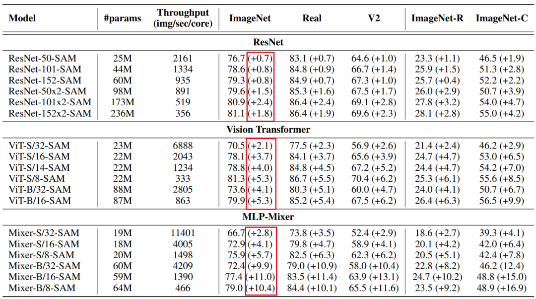 当使用SAM在ImageNet上从0开始训练时,ViT的准确性(在ImageNet、ImageNet-Real和ImageNet V2上)和健壮性(在ImageNet-R和ImageNet-R上)方面都优于类似和更大的ResNet(在推理时也具有相当的吞吐量)。