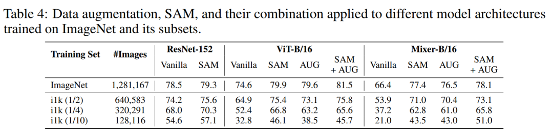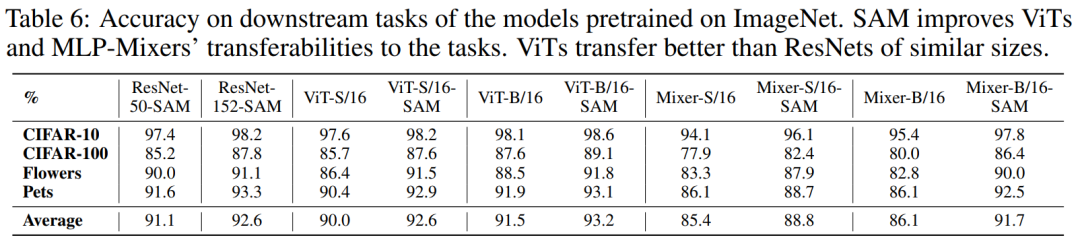 此外,SAM对更大容量(例如:+4.1%的Mixer-S/16 vs. +11.0%的Mixer-B/16)和更长的patch序列(例如:+2.1%的vits/32 vs. +5.3%的vits /8)的模型带来了更大的改进。