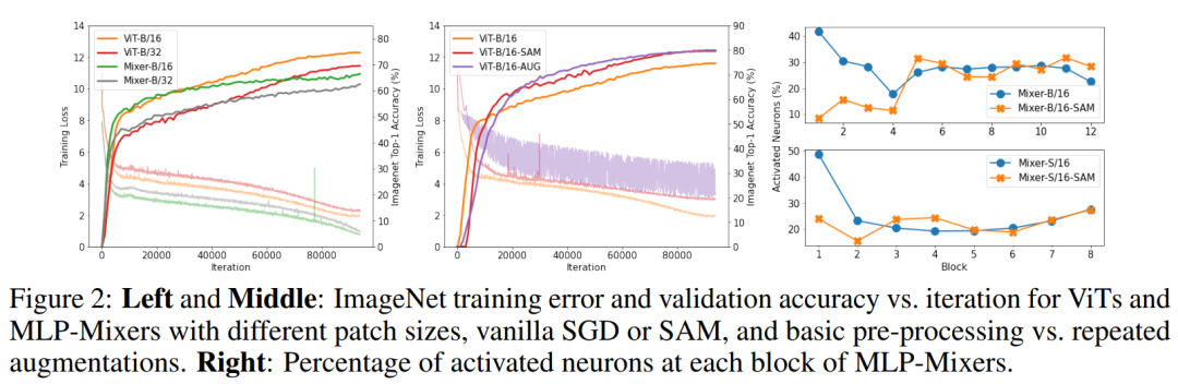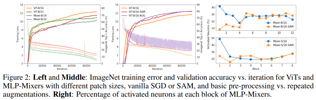 如图2(左)所示,使用SAM的ViT-B/16比使用vanilla SGD的训练误差更高。当在训练中使用强数据增强时,这种正则化效应也会发生,它迫使网络显式地学习RandAugment中的旋转平移等方差和mixup中的线性插值等先验。然而,增益对不同的训练设置很敏感(第5.2节),并导致高噪声损失曲线(图2(中间))。