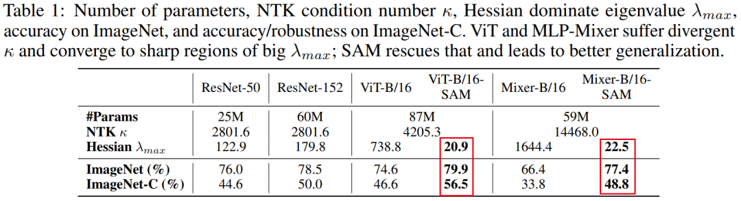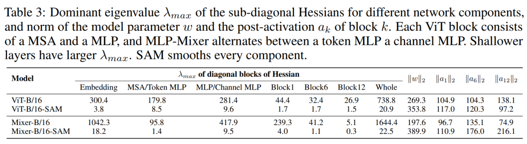 应用SAM后,作者发现激活后的值 的范数和权重 的范数变得更大(见表3),说明常用的权重衰减可能不能有效地正则化ViTs和MLP-Mixers。