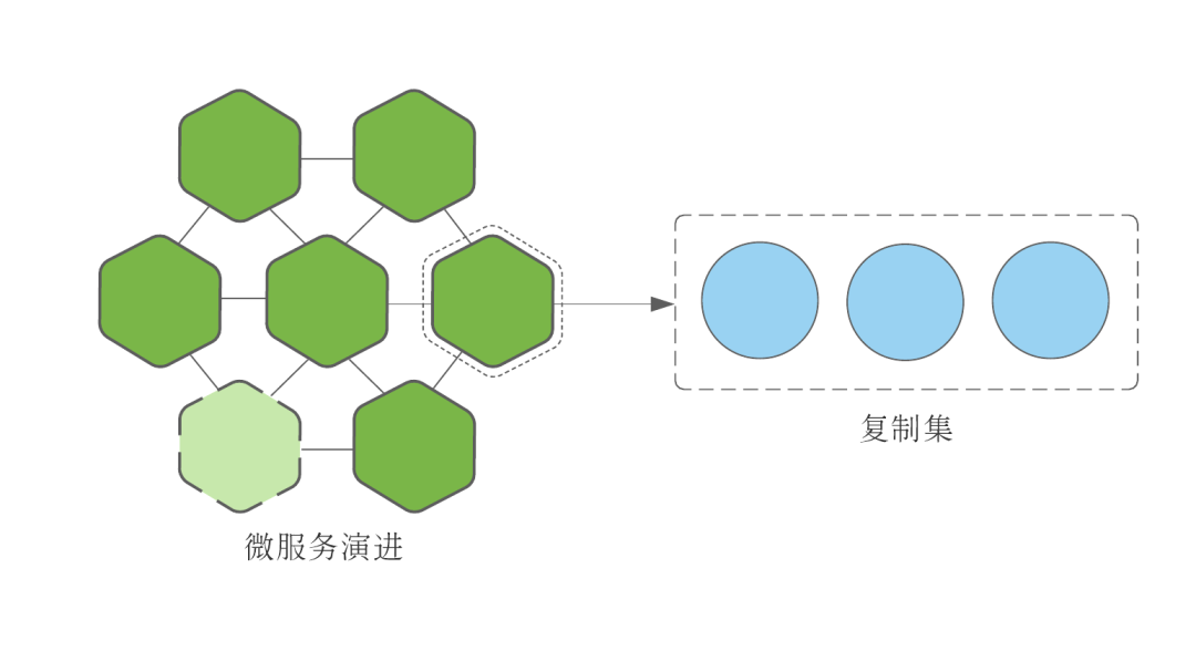 我们再来看看云原生的代表技术——微服务。作为一种应用架构,它可以让每个服务独立开发、部署、运行。除去解耦的优点,这种构建方式可以让应用按需迭代,像细胞分裂再生一般不断更新,实现所谓的演进式设计。这一特性使得应用在内在的组织结构上也是动态变化的。而不可变基础设施(如容器、Pod)让这一变化方式更易实现。下图展示了一个微服务应用的各个组成部分都可以独立演进,且每一个服务自身也可以基于需要独立扩展。