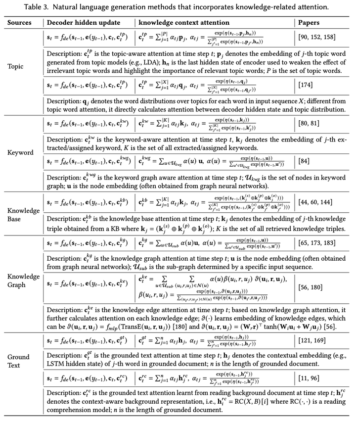 )加入到decoder中。下图3罗列了对于不同的知识类型,注意力机制的计算方式。