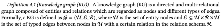 知识图谱是一个有向多关系图,由实体和关系组成。知识图谱通常定义为 ,其中 是实体节点集合, 是类型边集合。在这个章节,我们只考虑本体论中的知识图谱,即每个边都是完全无歧义的。