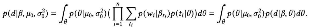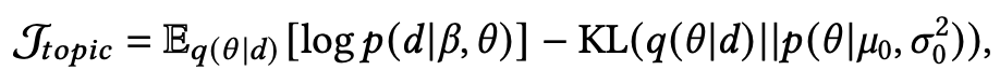 使用变分推断,利用神经主题模型增强文本生成 神经主题模型结合了神经网络和概率主题模型两者的优势,可以通过反向传播进行训练,并且很容易适应不同的上下文信息。在主题模型中,文档中的主题满足多元正态分布,主题中的单词同样也满足多元正态分布。为了促进主题模型中的推断,狄利克雷分布可以作为先验分布生成文档的多元正态分布中的参数 。因此,LDA中的生成过程可以表示为:(1) ;(2) ;(3) ,其中 表示文档bag-of-words表示, 表示单词 的主题, 表示在给定主题 下单词的分布。文档 的边缘似然函数为:
