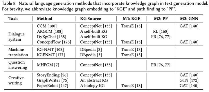 跳路径指的是从实体 出发,按照关系 连接而成的实体关系序列。下图8列出了目前将知识图谱融入文本生成任务的模型。