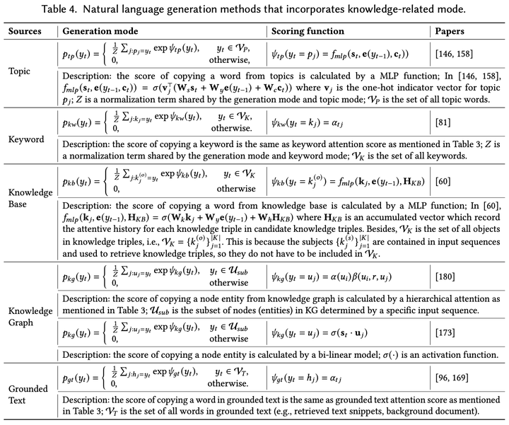 下面介绍几种广泛用于将知识融入生成模型的方法,包括注意力机制,拷贝机制,记忆网络,图网络和预训练模型。