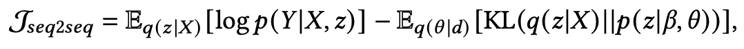 其中 T 是主题个数, 和 是多层感知器。具体来说,TGVAE将输入文档的bag-of-words映射为主题向量,然后使用主题向量重构得到bag-of-words,并且TGVAE会学习每个主题上的单词分布,这个分布会作为一个主题依赖的先验分布生成最后的文本 。因此,关于文档 和输出 的联合边缘似然函数为: