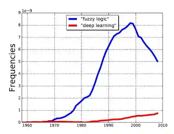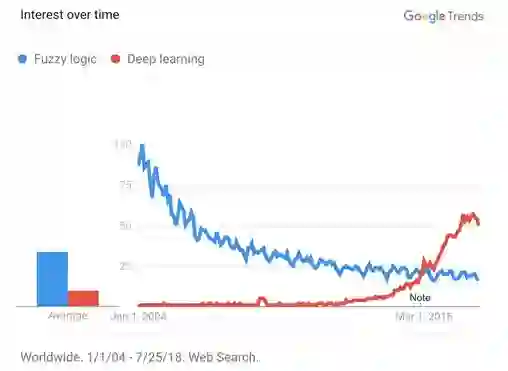 回顾人工智能的历史,从上世纪 60 年代开始引人注目的模糊逻辑 (fuzzy logic),发展历程中经历了一个完整的从经验主导到夯实理论基础,从大规模投入应用到日渐式微的过程。「你所经历的我都经历过」,让模糊逻辑相对于深度学习有了极大的借鉴意义。模糊逻辑或许并不为今天的深度学习研究者所熟知,但查询谷歌趋势,我们可以看到直至 2016 年以前,模糊逻辑的关键词搜索量都是超过深度学习的。如果把时间轴拉得更长,我们可以看到模糊逻辑的关注度从 70 年代到 90 年代后期,经历了一次大幅度的增长,而当时的深度学习则「养在深闺人未识」。