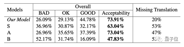 可以看到,在可接受度(Acceptability)上,机器同传与表现最好的人类选手表现相当(73.91% VS 73.04%)。