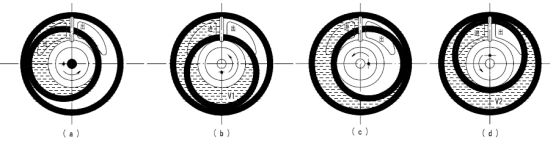 旋转活塞式流量计进出口由隔板隔开。当被测流体从进口进入计量室,这时进出口形成压差,迫使活塞逆时针旋转如图a所示。流体连续流入,迫使活塞转动如图b所示,形成二个半月牙腔体,在压差作用下迫使活塞转动如图c,V2流体从出口排出,使活塞转动如图d所示,在压差作用下转动,活塞每转一周迸出的流体等于V1+V2的和。