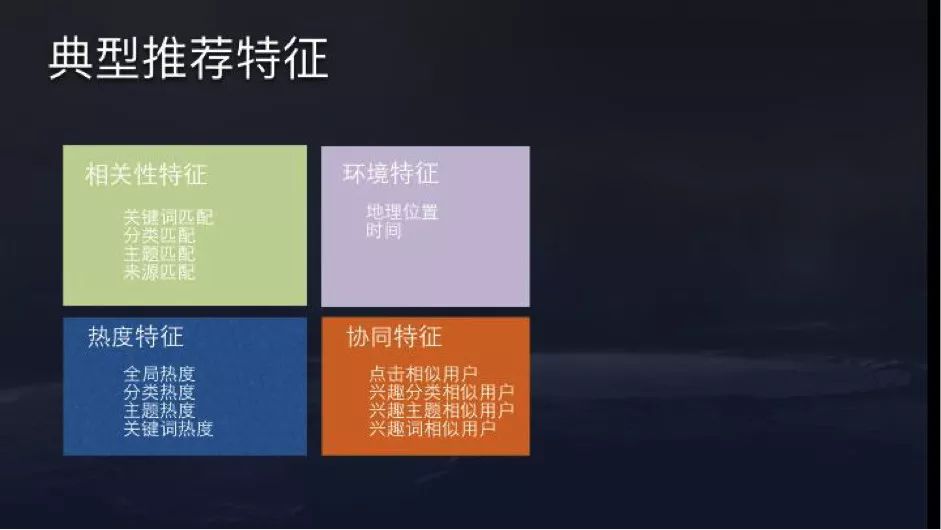 在解释了算法之后,曹欢欢进一步解密了头条的推荐如何工作。曹欢欢表示,主要有四类最重要的用户特征,将会输入给算法,影响到推荐算法的工作。