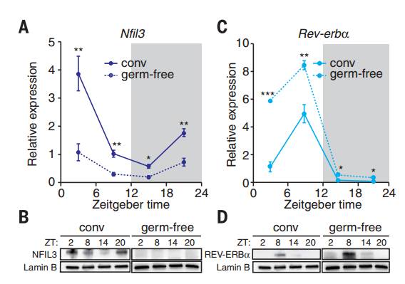 无菌小鼠和有肠道菌群的小鼠体内的NFIL3(B)和REVERBa同光纤(睡眠节律)变化对比
