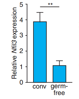与无菌小鼠相比,含有肠道微生物的正常小鼠小肠上皮细胞中NFIL3转录因子的表达量显著上调近70%。