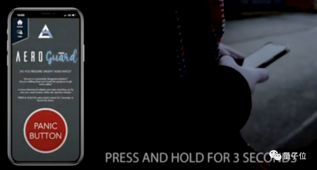 此时她决定呼叫帮助:点击手机App上的“Panic Button”按钮,长按3秒,一键召唤无人机。