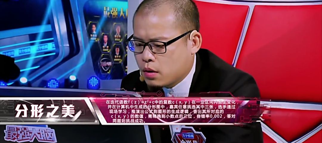 《最强大脑》节目基于分形理论创造出的数学项目:“分形之美”,复杂的理论、函数方程以及海量图形的组合让现场嘉宾很是崩溃。陶晶莹坦诚表示:“这是我四季以来唯一弄不懂的项目。”刘国梁也是一脸懵圈的表情:“我觉得数学家们啊,就像天外飞仙,跟我们是两个世界的,Dr.魏解释了我也听不懂!”章子怡更是直言:“我觉得《最强大脑》应该更名为‘最强烧脑’了。”许多网友感叹:“比赛规则完全看不懂。”