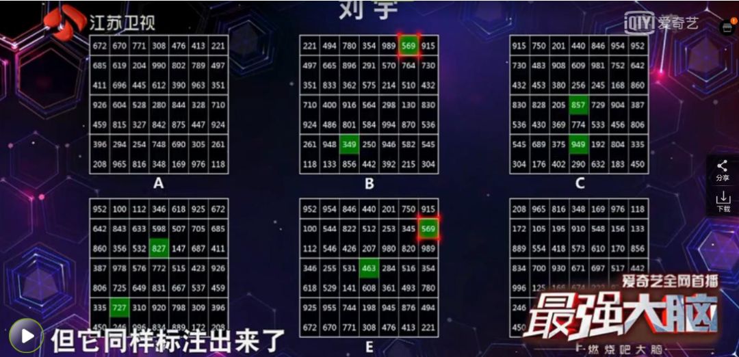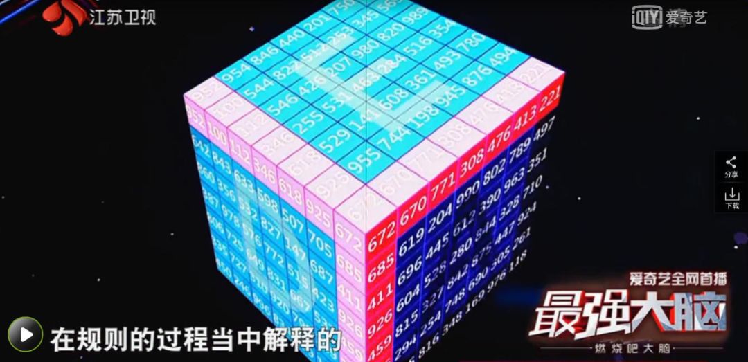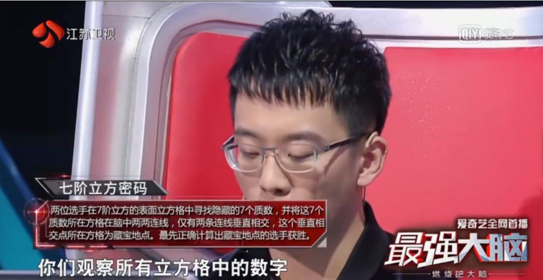 最主要的是在 343 个立方格中,存在着很多干扰数字,这些都是非质数,因为此需要 选手通过心算进行排除。并且在选手知道了七个质数之后,立方就会展开,不是立体的图形 而是一个正方形的平面,这也就意味着选手需要空间想象力,来推测谁和谁是垂直并且相交。