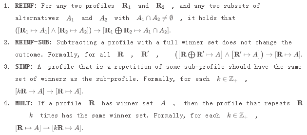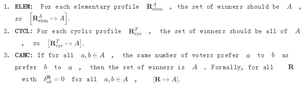 在这里提到的对称性、有效性公理和相容性公理是两个大类的公理。本文一大创新之处就是几类相似的公理给抽象出来。还是以 Borda 为例,我们使用了如下3个对称性、有效性公理: