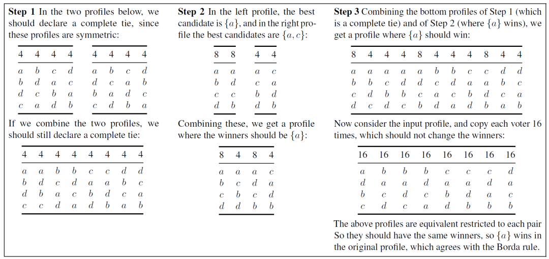 对于每个子输入,使用其于对称性和有效性的公理来得到相应的胜者。例如对于 (a, b, c); (b, a, c),由于在这个输入中 a, b 的位置是对称的,且严格优于 c,因此可以得到这个子输入的胜者应该是 {a, b}。