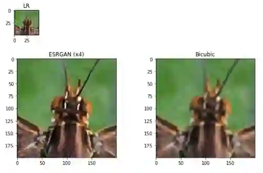 LR: 输入的低分辨率图片,该图从 DIV2K 数据集中的一张蝴蝶图片中切割出来. ESRGAN (x4): ESRGAN 模型生成的超分图片,单边分辨率提升4倍. Bicubic: 双三次插值生成图片. 在这里大家可以很容易看出来,双三次插值生成的图片要比 ESRGAN 模型生成的超分图片模糊很多