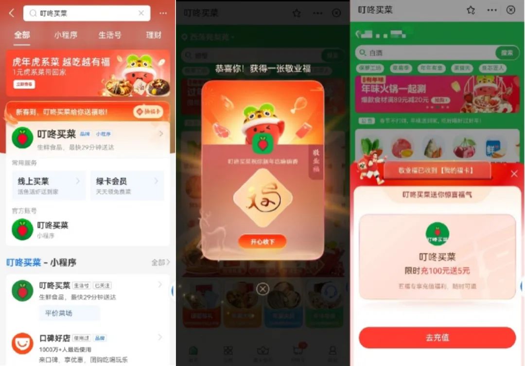 数据显示,活动期间,古茗支付宝小程序单日访问峰值周环比上涨60倍;蜜雪冰城单日最高有546万人进蜜雪冰城支付宝小程序,领走了750万张福卡;叮咚买菜推出“五福年夜饭”预制菜优惠套餐,在支付宝小程序上线仅两天全部抢空,其小程序也创下了历史访问量峰值,远超去年同期。