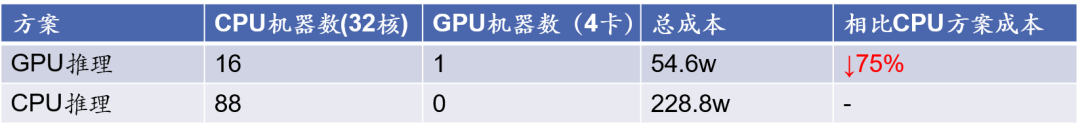 在相同精排请求 600 QPS,3000 Batch size 下,经测算模型推理机器成本节省约 75% 左右。