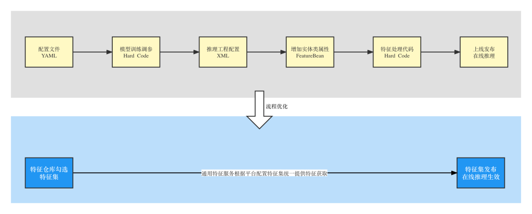 模型离线训练过程比较长,分为前期的高效调参与离线训练,算法同事在对参数等调整和验证之后,通过编写 YAML 文件设定模型训练参数,执行分布式调度任务,完成模型的训练及生成。在部署模型服务的时候,算法同事首先需要与工程开发人员沟通该模型使用到特征及使用方式,然后工程同事据此来编写特征查询 XML 与模型特征拼接的实现代码,通过离线验证后,需要手动在发布系统部署该模型成为在线服务。特殊情况下,可以由算法同事来编写模型特征拼接的实现逻辑,但是这对于算法同事的工程能力要求较高,另外,就算可以实现,编写与执行效率也难以得到保证。