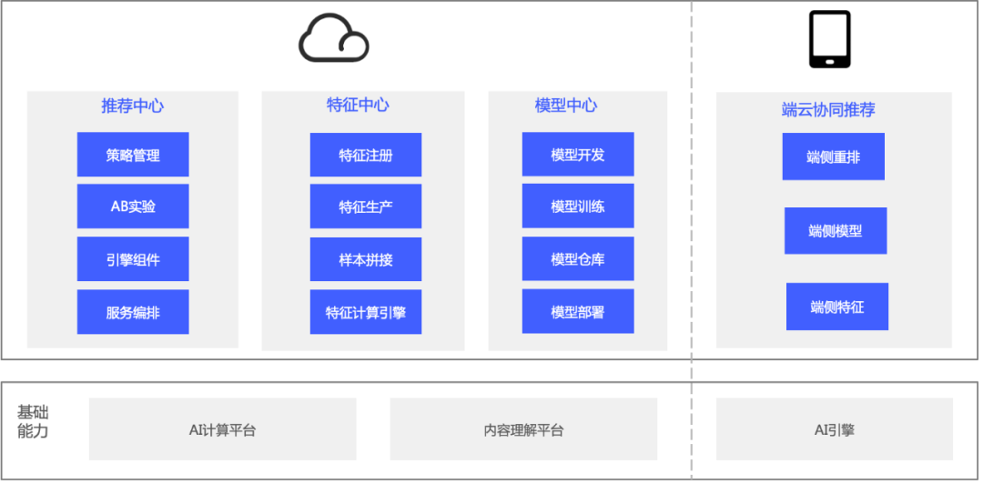 vivo 推荐业务包括浏览器信息流、横版视频、广告、直播、小说等互联网业务,以及负一屏信息流、阅图锁屏、i 音乐、i 主题等 ROM 场景业务。推荐形式多样,内容类型繁多,堆积的推荐需求和紧凑的业务上线时间节点,导致人力紧、时间赶。因此,vivo 人工智能推荐团队从业务定制的烟囱模式走向框架抽象,以实现推荐算法全流程的标准化、自动化、规模化开发为目标,打造能力复用的玲珑·推荐中台。玲珑·推荐中台主要为数据及算法工程师提供从算法策略到 A/B 实验的工程架构解决方案、通用的特征服务和样本生产服务、模型的离线训练到上线部署全生命周期管理、高性能推理等能力。玲珑·推荐中台包含四大模块:推荐中心、特征中心、模型中心、端云协同推荐。