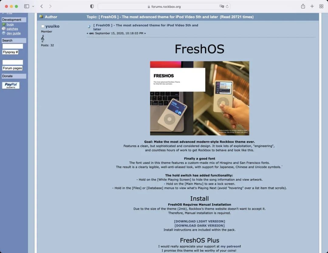 是基于 Rockbox 的一款第三方主题,有 Light 和 Dark 两个版本。安装同样非常简单,下载 FreshOS 后将 .rockbox 文件夹内所有文件拖进 iPod 的 .rockbox 文件夹内直接覆盖即可完成安装。