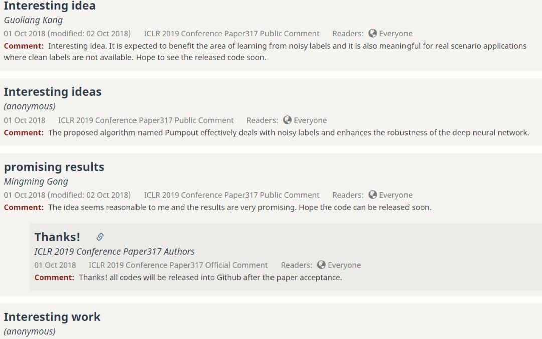刚开始评论区出现了一些未匿名的评论,赞其使用的方法简单、合理,很巧妙地利用了噪声数据的信息。作者也给出了积极的回应。