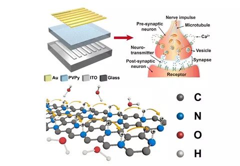 为解决上述问题,中国科学院上海微系统与信息技术研究所研究员丁古巧课题组与深圳大学电子科学与技术学院副教授韩素婷、深圳大学高等研究院研究员周晔合作,利用新型碳基二维半导体材料C3N实现了可调突触行为的人工突触模拟忆阻器。该器件可以实现电阻值随着连续的电压扫描而逐渐变化的典型的忆阻行为。近常压X射线光电子能谱证实C3N薄膜中的质子传导过程实现了器件的忆阻特性。C3N中大量的晶格N原子使其成为高质量的质子接受材料。与此同时,在C3N与PVPy之间的氢键网络有助于质子传导。该忆阻器能实现多种生物突触中的突触可塑性模拟,包括兴奋性突触后电流、双脉冲易化、双脉冲抑制、双脉冲易化转换为双脉冲抑制以及强直后增强等。